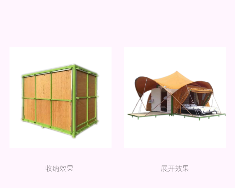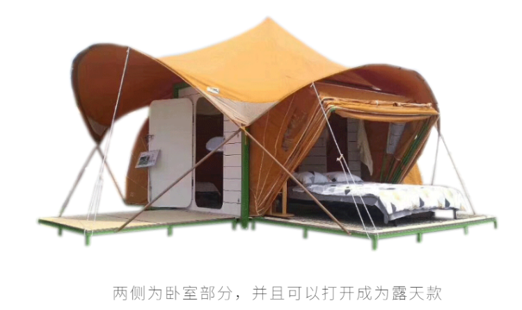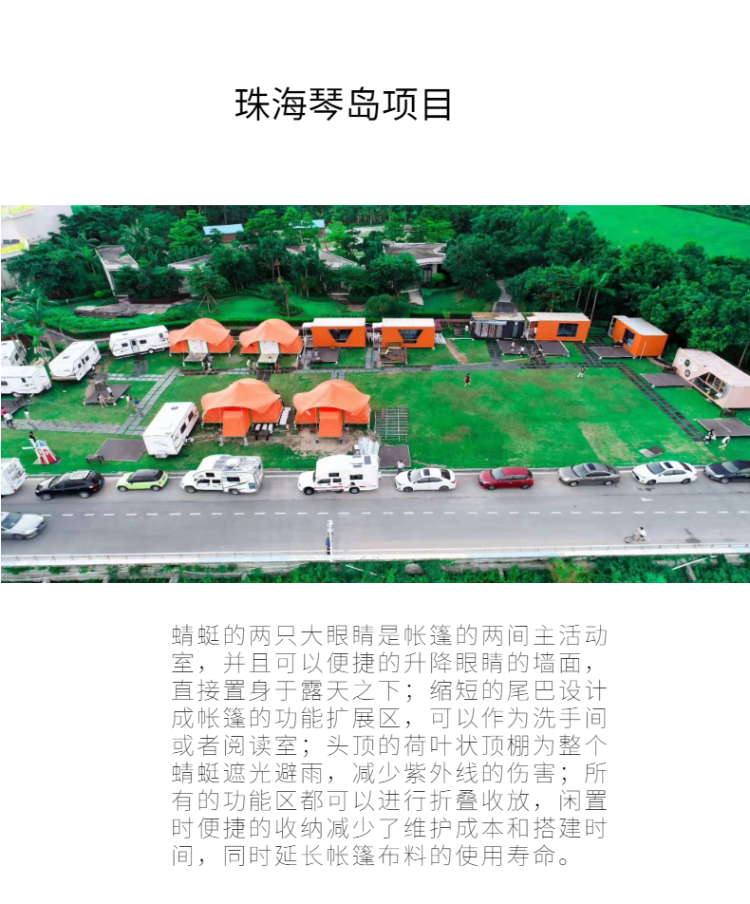 蜻蜓的兩只大眼睛是帳篷的兩間主活動室,并且可以便捷的升降眼睛的墻面,直接置身于露天之下;縮短的尾巴設(shè)計(jì)成帳篷的功能擴(kuò)展區(qū),可以作為洗手間或者閱讀室;頭頂?shù)暮扇~狀頂棚為整個蜻蜓遮光避雨,減少紫外線的傷害;所有的功能區(qū)都可以進(jìn)行折疊收放,閑置時便捷的收納減少了維護(hù)成本和搭建時間,同時延長帳篷布料的使用壽命。