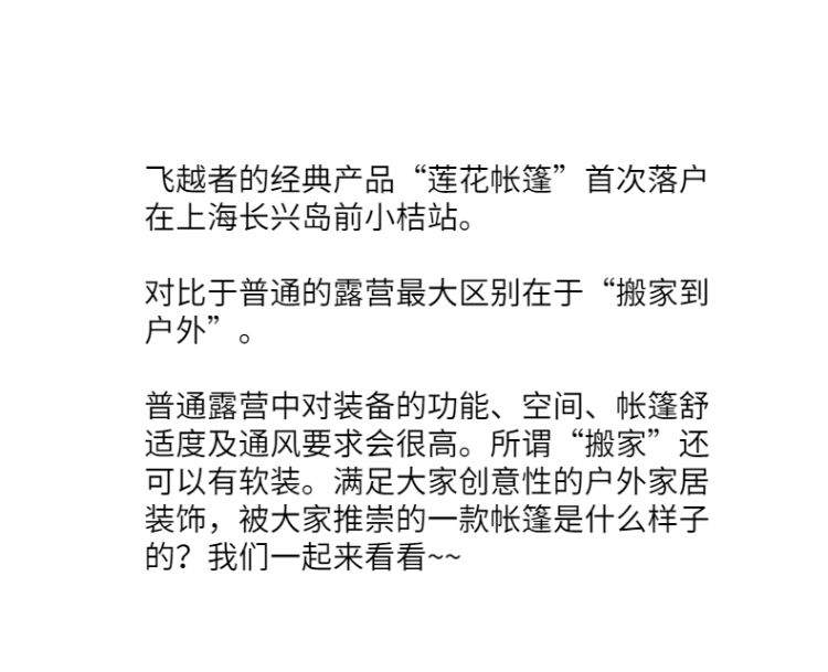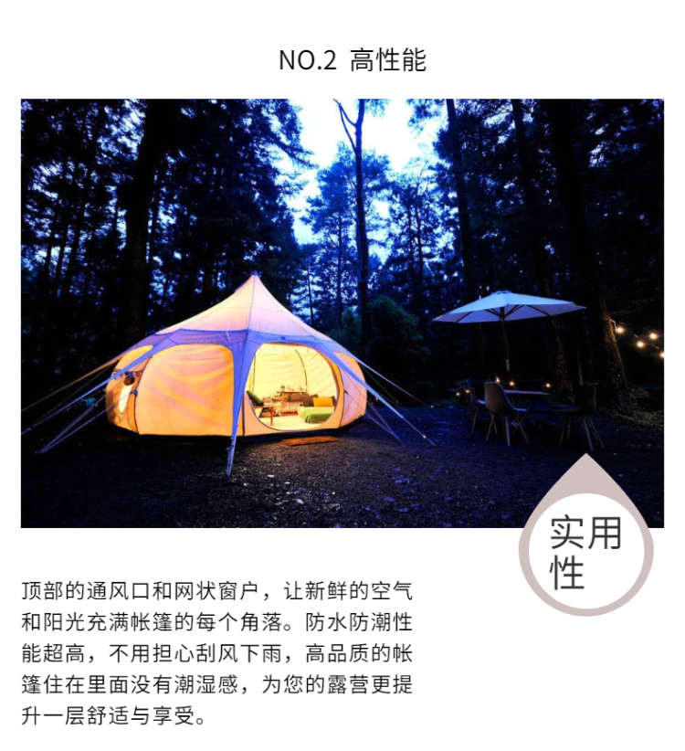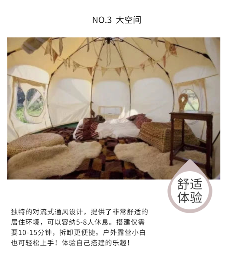 別致的外觀設(shè)計(jì)、頂部還有通風(fēng)口和網(wǎng)狀窗戶,讓新鮮的空氣和陽光充滿帳篷的每一處角落。防水防潮性能超高,完全不用擔(dān)心刮風(fēng)下雨,讓你的計(jì)劃不會(huì)因?yàn)樘鞖庥懈膭?dòng),高品質(zhì)的帳篷住在里面完全沒有潮濕感,即使在多雨的南方,也能完美勝任。